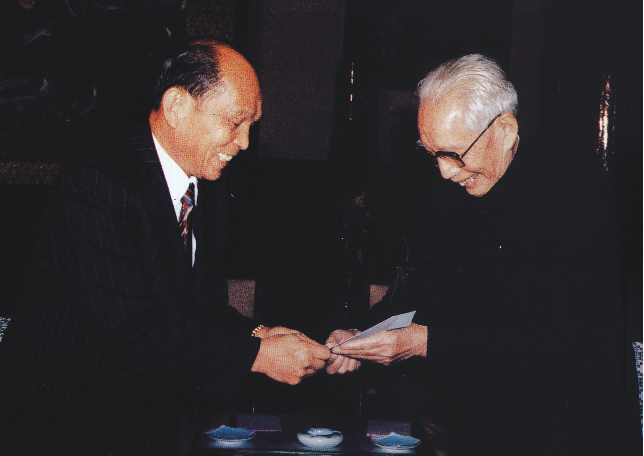 1986年11月29日,首任理事长王震接受香港中华总商会会长霍英东捐款港币500万元