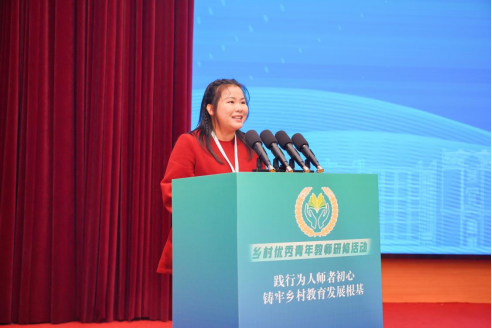 学员代表、新蔡县孙召镇初级中学教师单梦换在发言时分享了自己扎根乡村讲台的坚守历程。她以创新教学方法提升学生素养、牵头成立省级名班主任工作室、积极投身教育公益的实践故事,生动诠释了新时代乡村青年教师的责任与担当,一句“俺相信咱乡村教育的明天一定会更‘中’”的朴实话语,道出了全体乡村教师对教育事业的赤诚与期盼,赢得现场阵阵掌声。